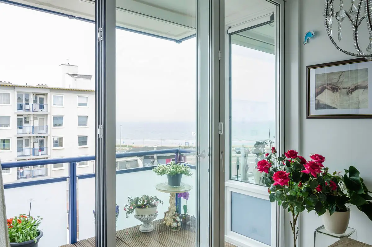 Ga naar de inhoudEen appartement in Zandvoort met balkon is voorzien van vouwwand met isolatieglas in witte uitvoering.